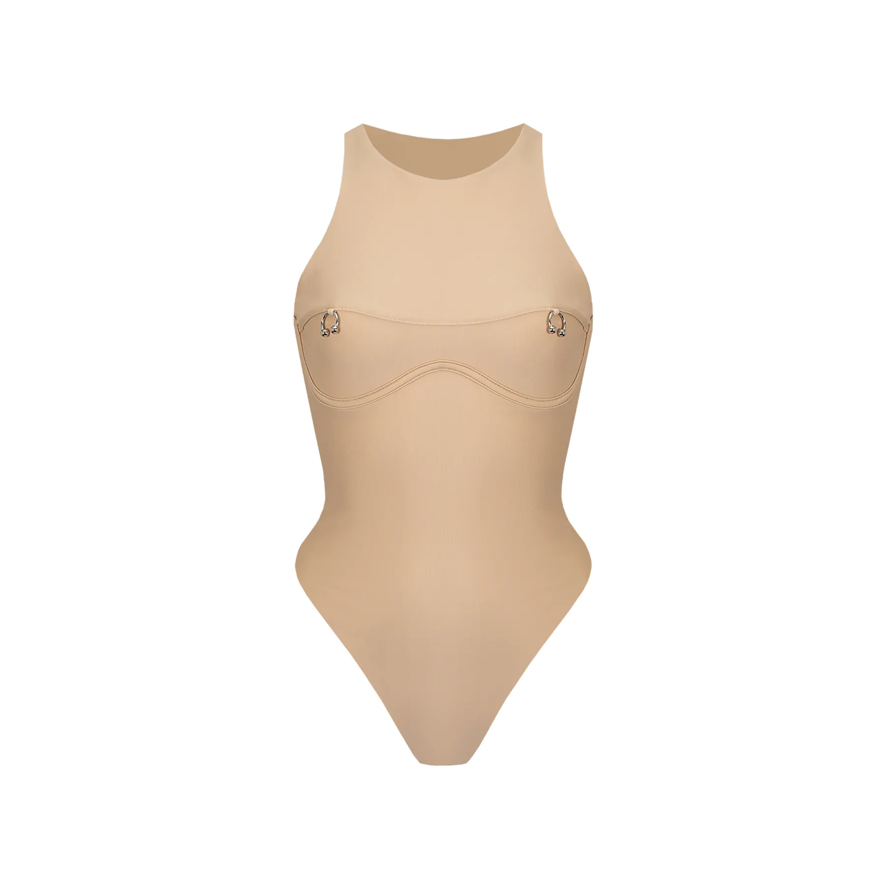 Боді з пірсингом та коротким рукавом Metallic Light Beige